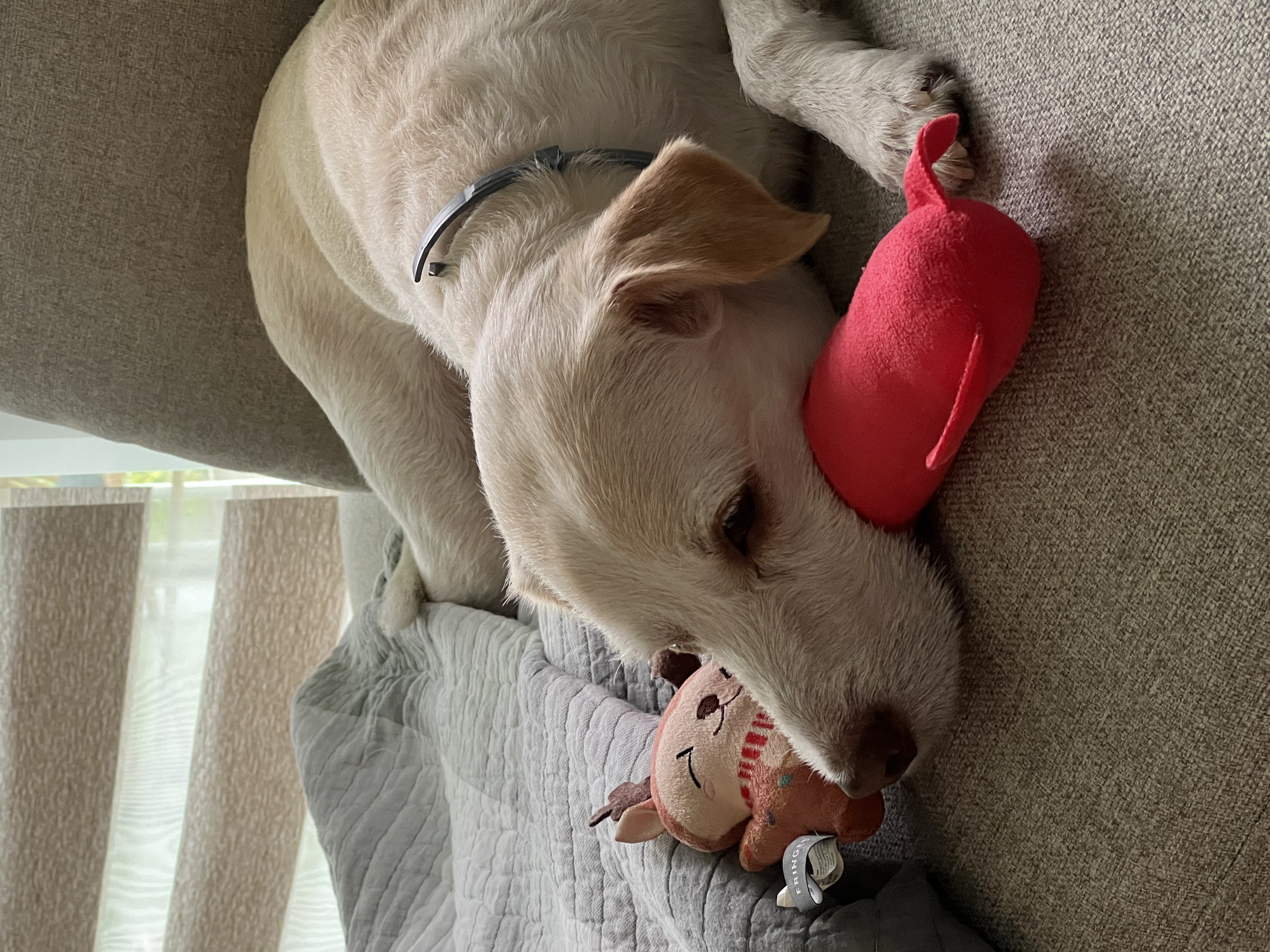 Hola! Responde al nombre de Snow y tiene un collar anti-pulgas gris. Es blanco con manchas cremas y ojos verdes.